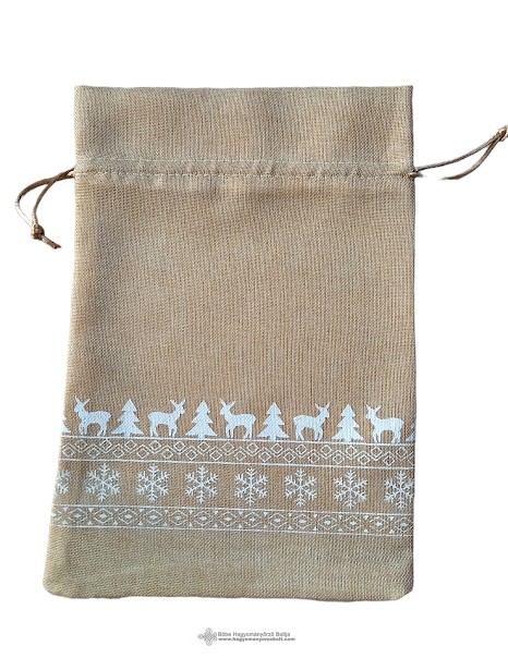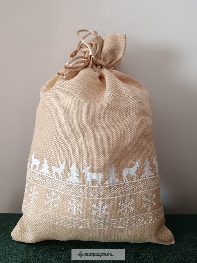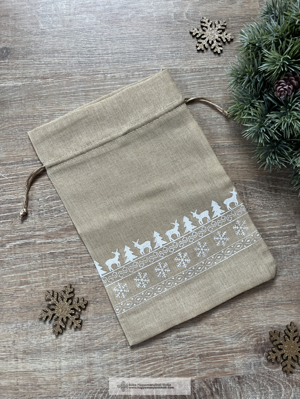 A bézs Mikulás zsák elegáns és praktikus választás az ünnepi ajándékokhoz. Hópehely, szarvas és fenyőfa mintáival igazi karácsonyi hangulatot varázsol, miközben környezetbarát megoldást nyújt az ajándékozáshoz.