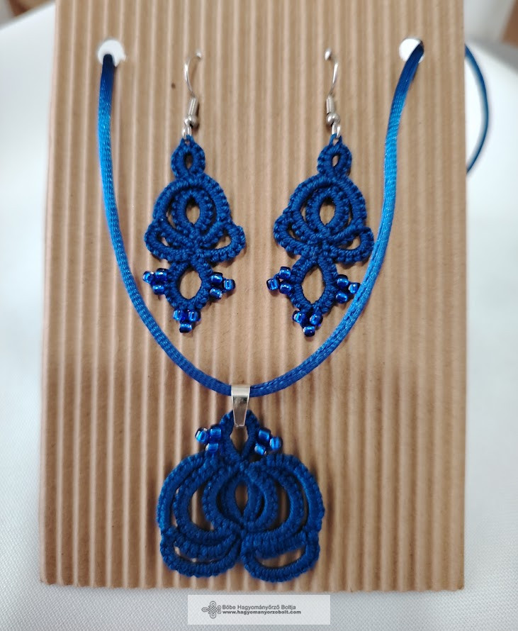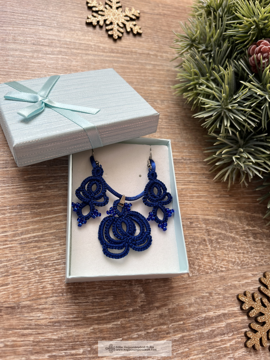 Kék hajócsipke ékszerszett kásagyönggyel – fülbevaló és nyaklánc medállal