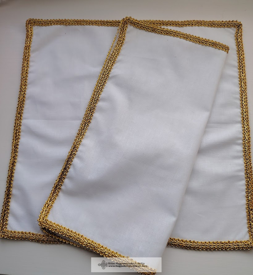 Elegáns, hófehér pamutvászon keszkenő arany színű csipkés szegéllyel. A néptáncosok, hagyományőrzők és népviselet-kedvelők egyik legszebb, klasszikus kiegészítője.
