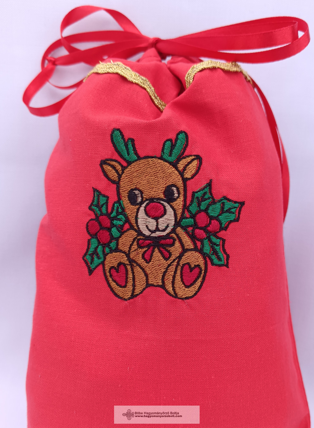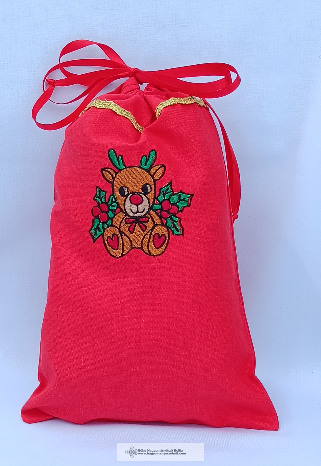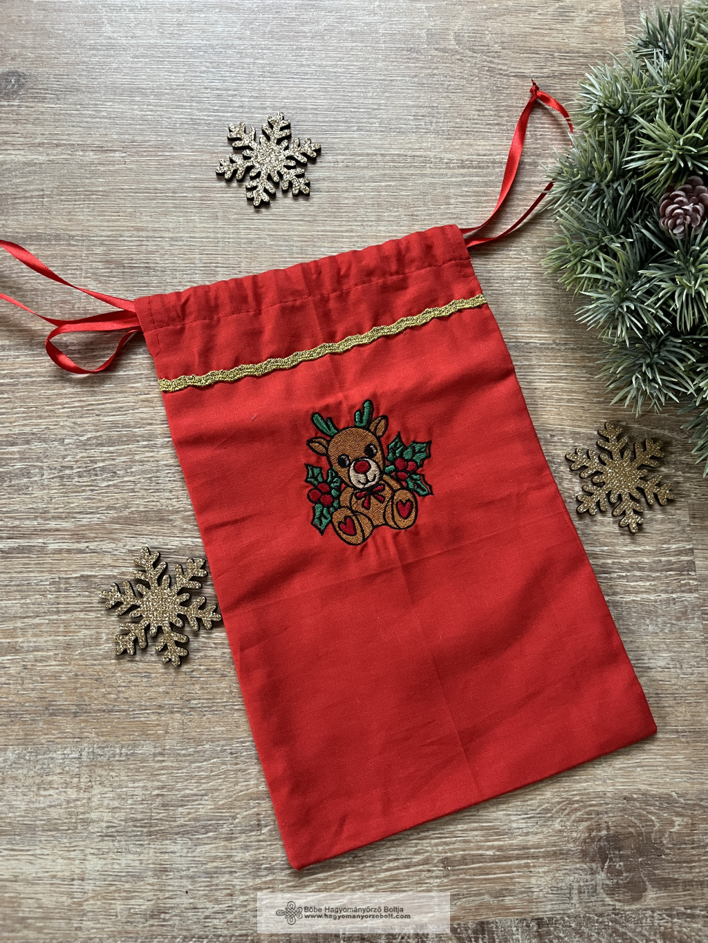 Ez a piros színű, hímzett textil zsák nemcsak bájos és praktikus, hanem fenntartható megoldás is – minden évben újra használható, így véded vele a környezetet és megőrzöd a karácsony meghitt hangulatát.