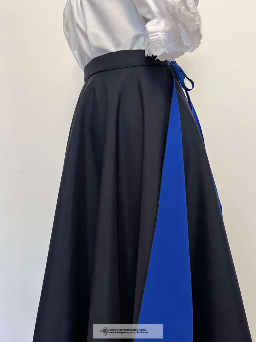 Ez a különleges, kétoldalas szoknya minden néptáncos és hagyományőrző álma. Egyik oldala elegáns sötétkék, a másik pedig vibráló királykék – így bármilyen fellépéshez, próbához vagy ünnepi alkalomhoz könnyen igazíthatod a megjelenésed.