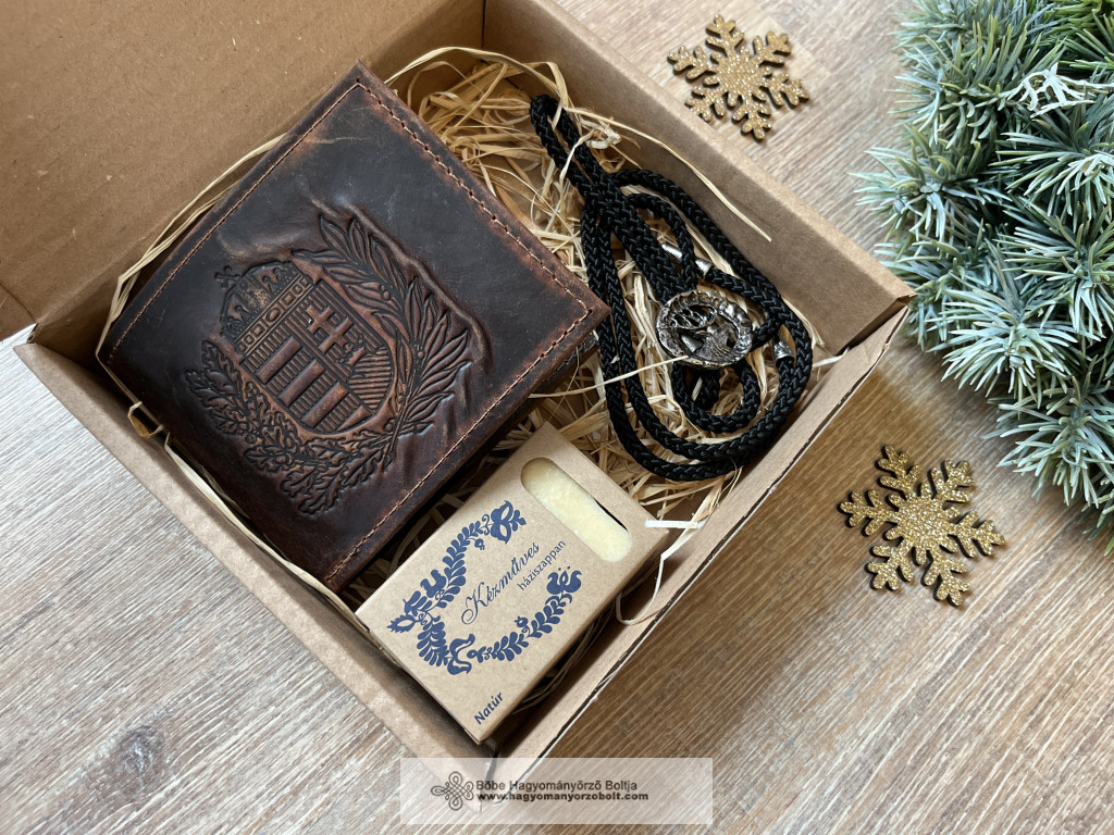 A Férfi ajándékcsomag – Boldog Karácsonyt! egy igényes, hazai kézműves összeállítás, amelyben a címeres bőr pénztárca, a szarvasos nyakdísz és a kézműves szappan tökéletes harmóniában alkotnak egy elegáns ajándékot.