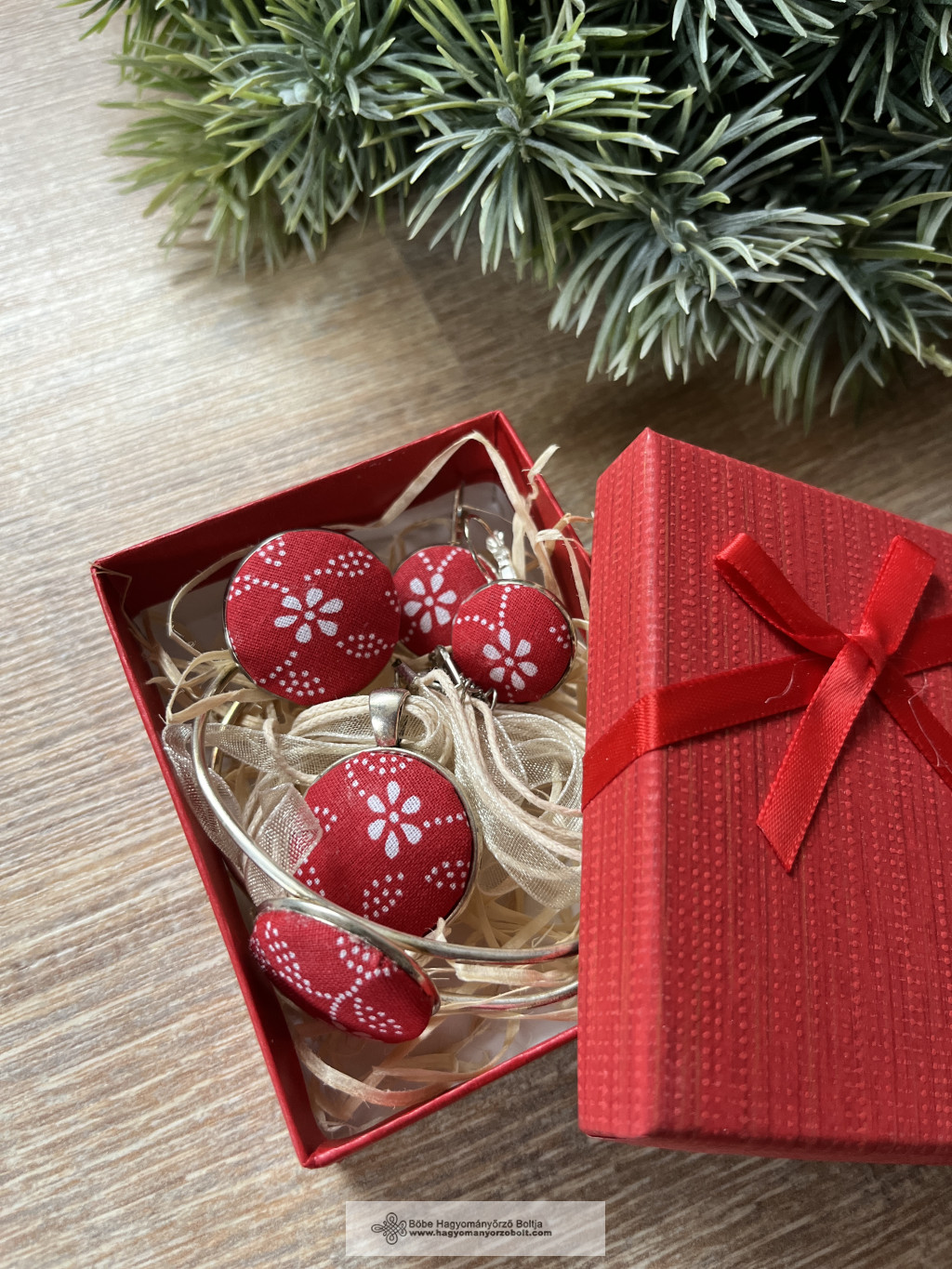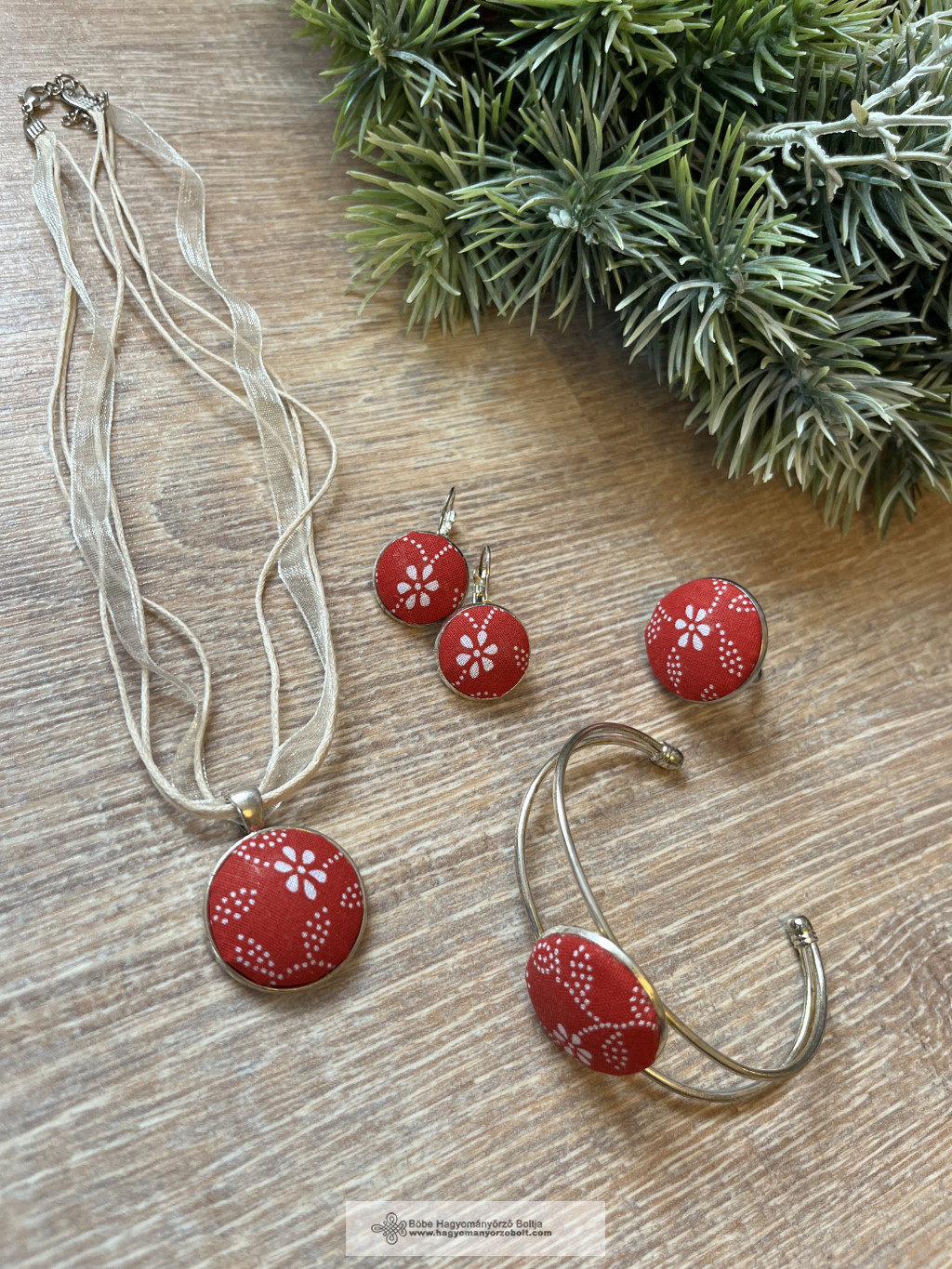 A piros alapon fehér virágmintás ékszerek finom nőiességet és hagyománytisztelő eleganciát sugároznak – tökéletes választás minden korosztálynak.