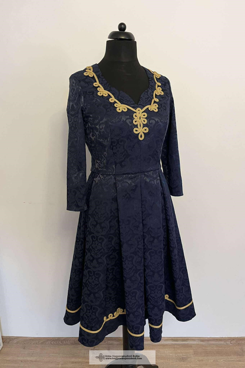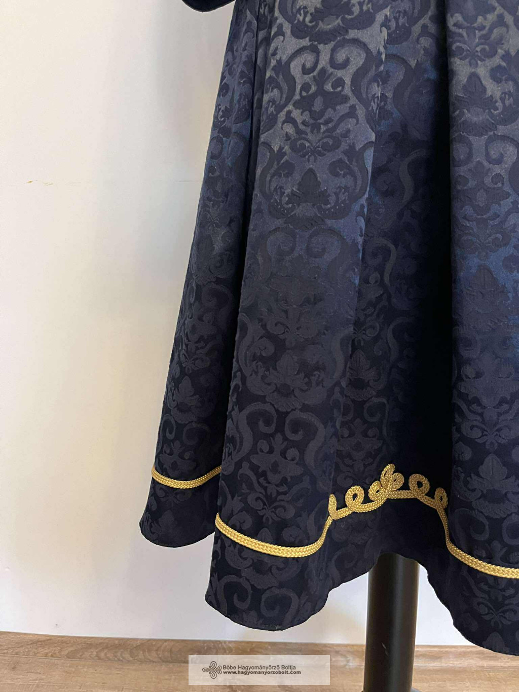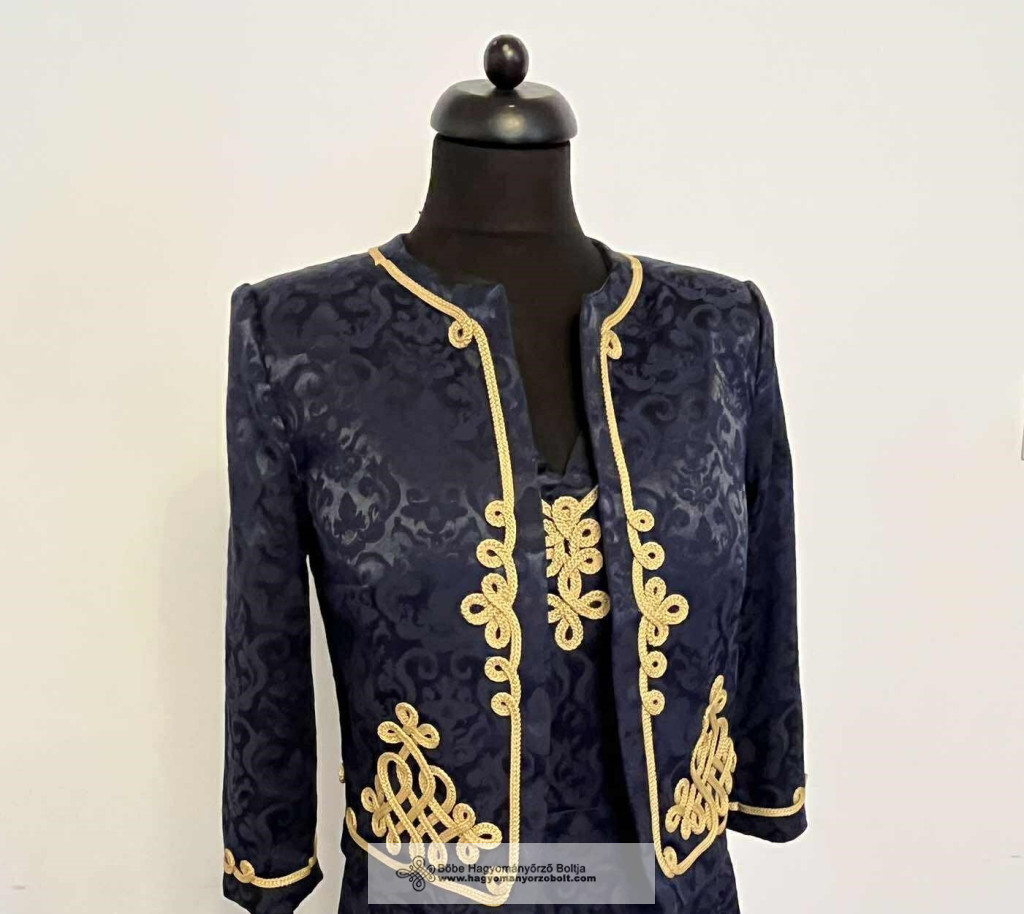 Az Etus női kosztüm a hagyományos magyar díszítések és a modern női divat tökéletes szintézise. Két részes szett (kabátka + bővülő szoknyás ruha), sötétkék jacquardból, arany sujtásos díszítéssel és szív alakú nyakkivágással. Elegáns, kényelmes, nőies és minden alkalomra méltó választás.