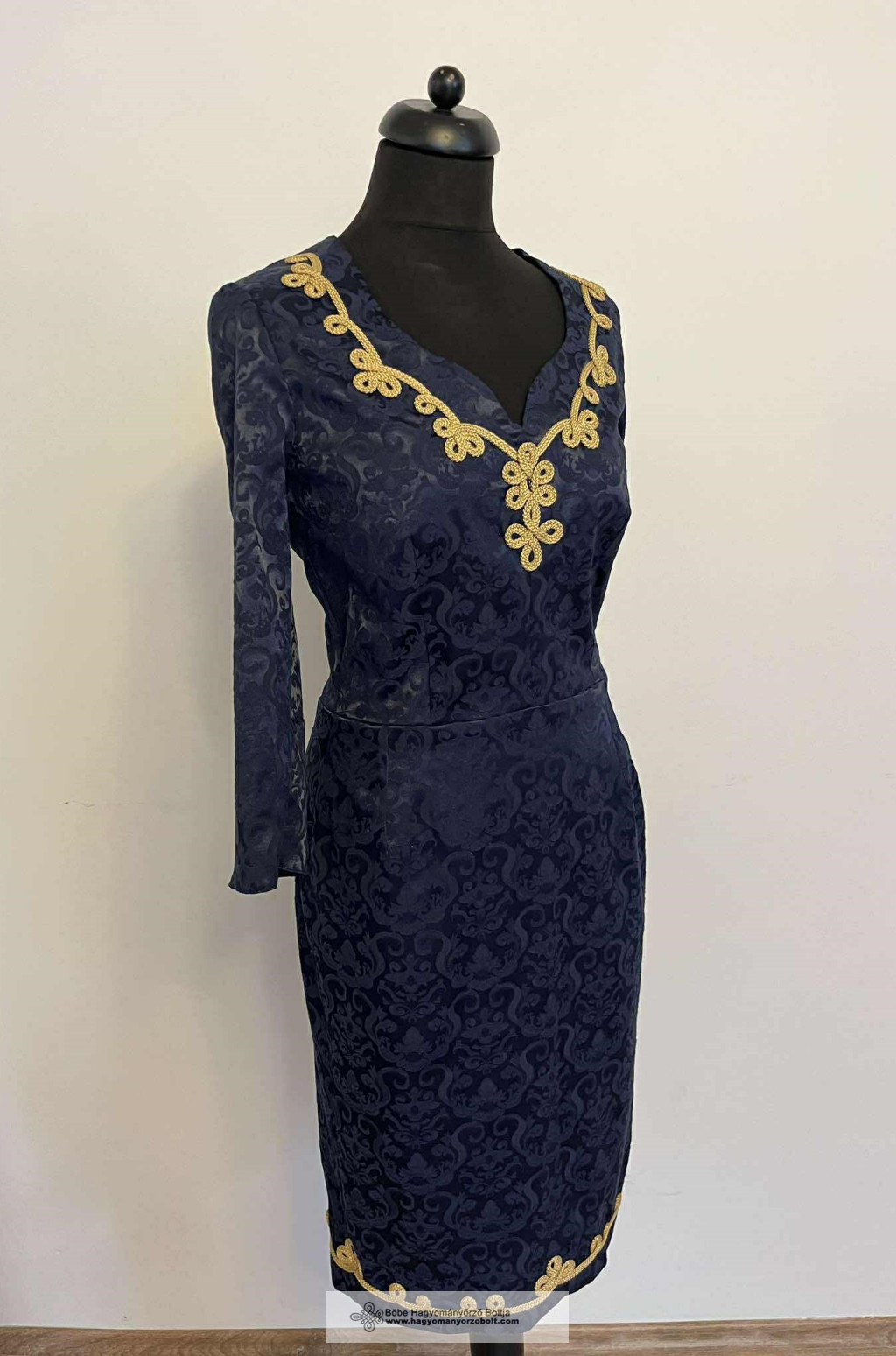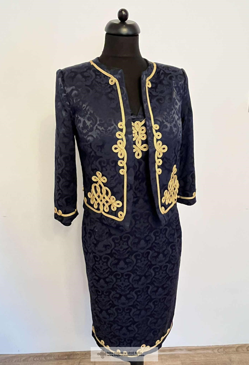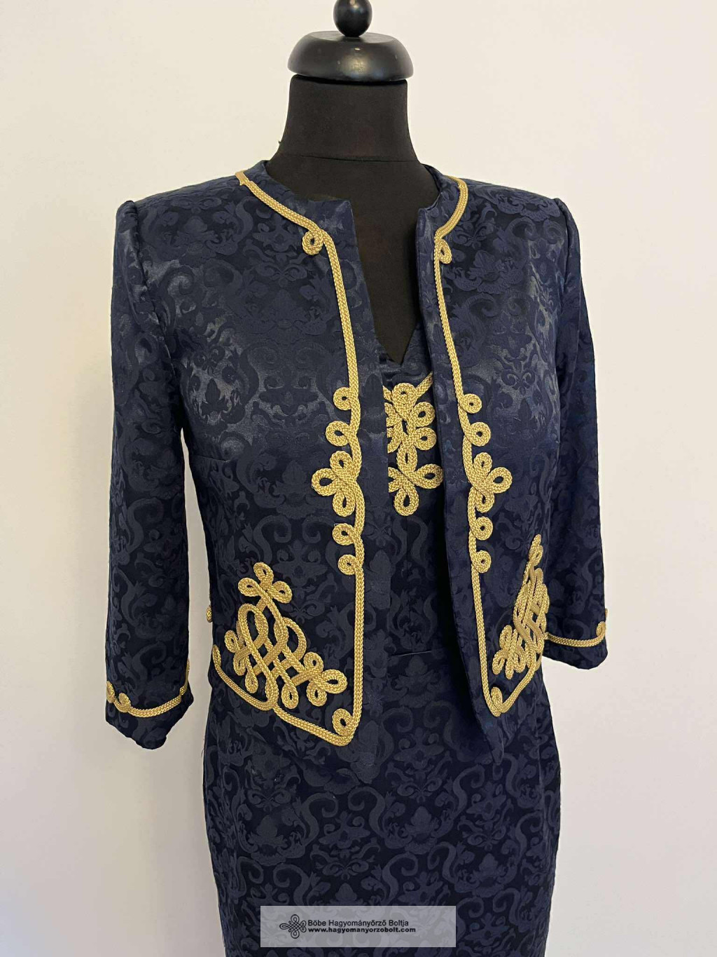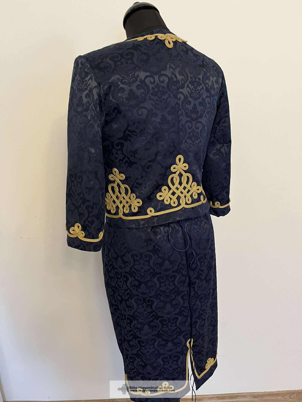 Az Etelka női kosztüm különlegessége, hogy ötvözi a modern nőies szabást a hagyományőrző díszítéssel. A sötétkék jacquard anyag önmagában mintás, finoman fénylő, exkluzív megjelenést kölcsönöz. Az arany sujtás elegáns kontrasztot alkot, amely azonnal magára vonja a tekintetet.