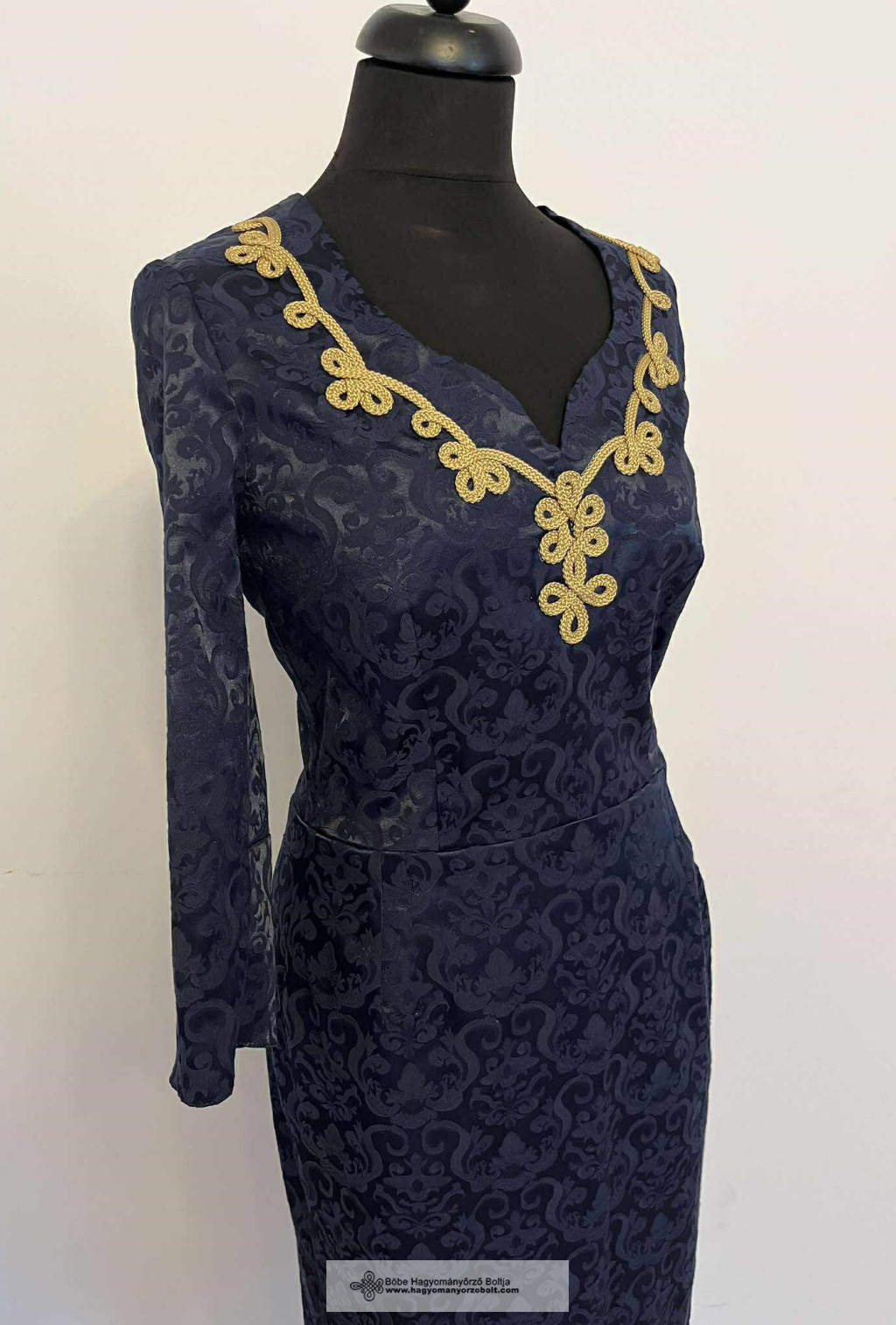 Kifinomult elegancia és magyar hagyomány egyetlen viseletben: az Etelka női kosztüm két részes szettje (kabátka + ruha) sötétkék jacquard anyagból, arany sujtásos díszítéssel, szív formájú nyakkivágással és testet követő szoknyavonallal. Modern szabásvonala miatt minden alkalommal tökéletes választás.