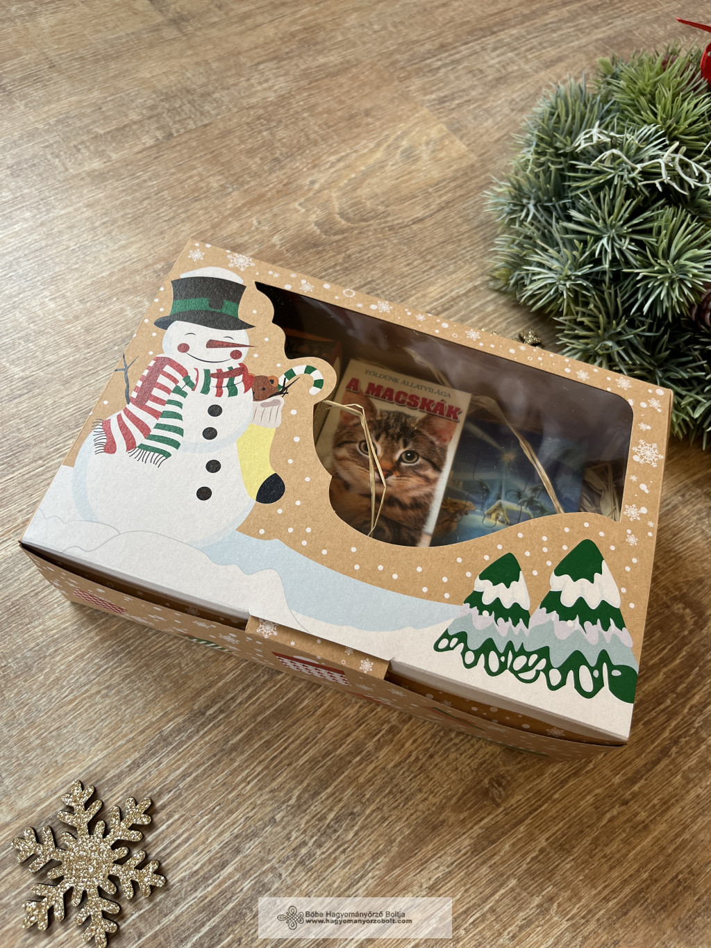 Igen, vidám hóemberes és fenyőfás karácsonyi dobozban, ajándékozásra készen.