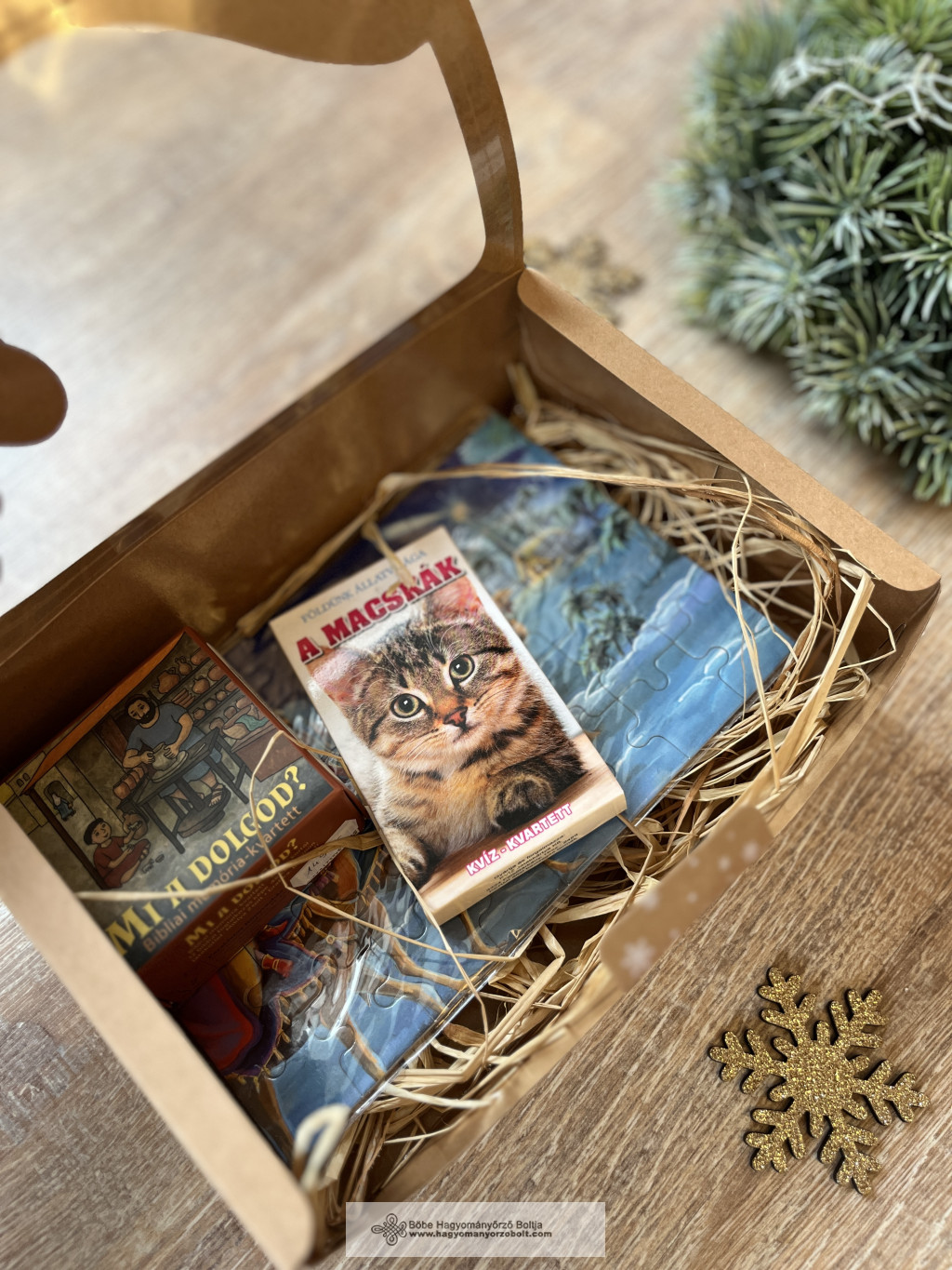 A karácsonyi gyerek ajándékdoboz egy szeretettel összeállított csomag, amely három különleges játékot tartalmaz: bibliai memória kvartettet, három királyos puzzle-t és macskás kártyajátékot. A doboz külsejét vidám hóember és fenyőfa díszíti, így már első pillantásra karácsonyi hangulatot áraszt.