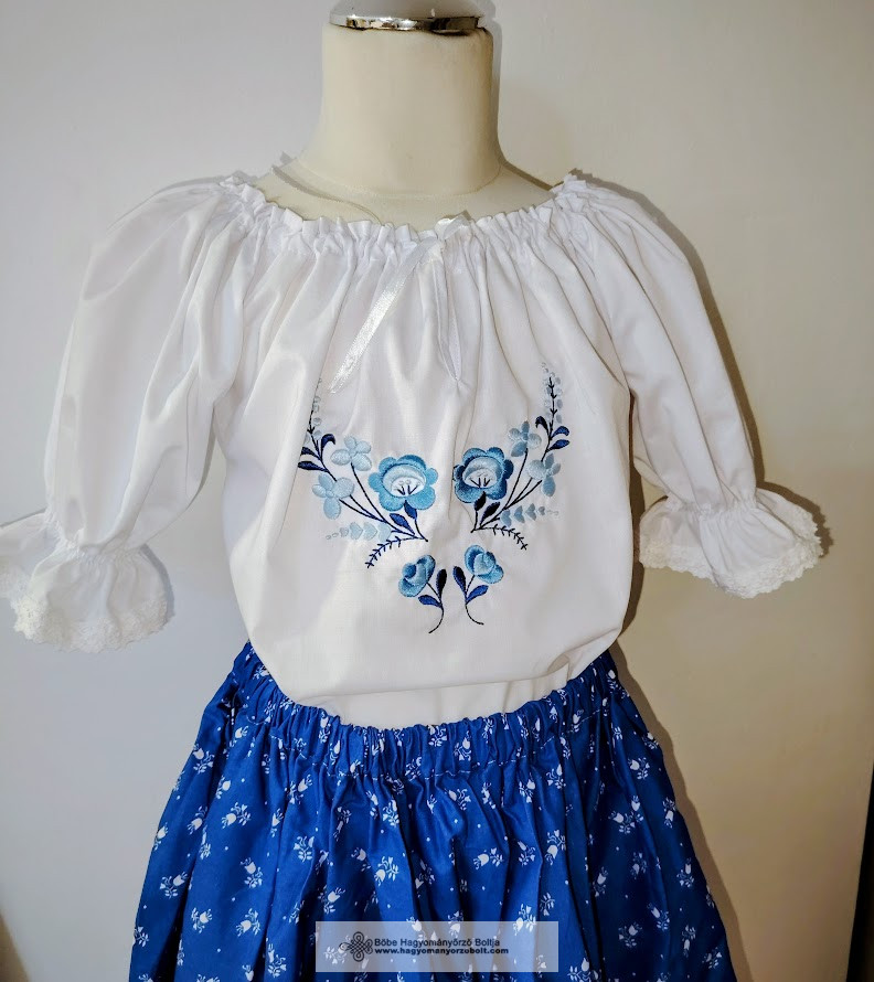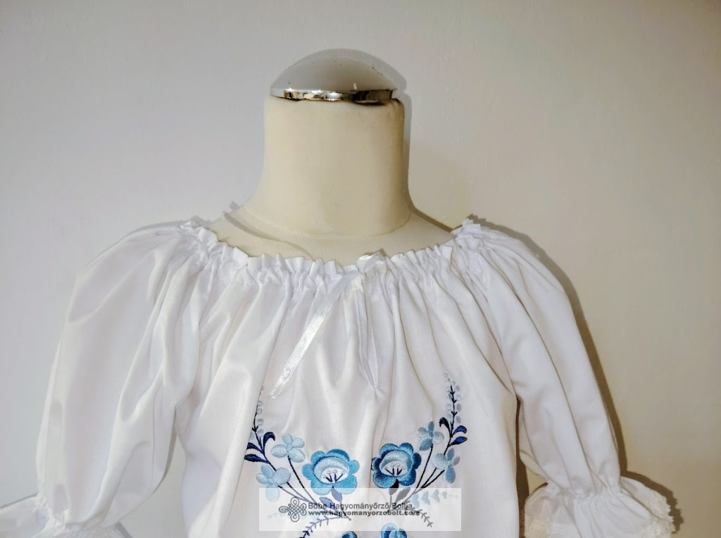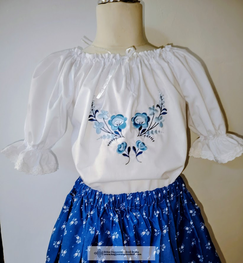 Gyönyörű fehér hímzett kislány blúz, gépi hímzéssel, kék kalocsai motívummal díszítve. Buggyos ujjú, pamutcsipkével szegélyezett, szalagos, állítható nyakkivágással. Puplin anyagból készült, kényelmes viselet óvodásoknak és iskolásoknak.