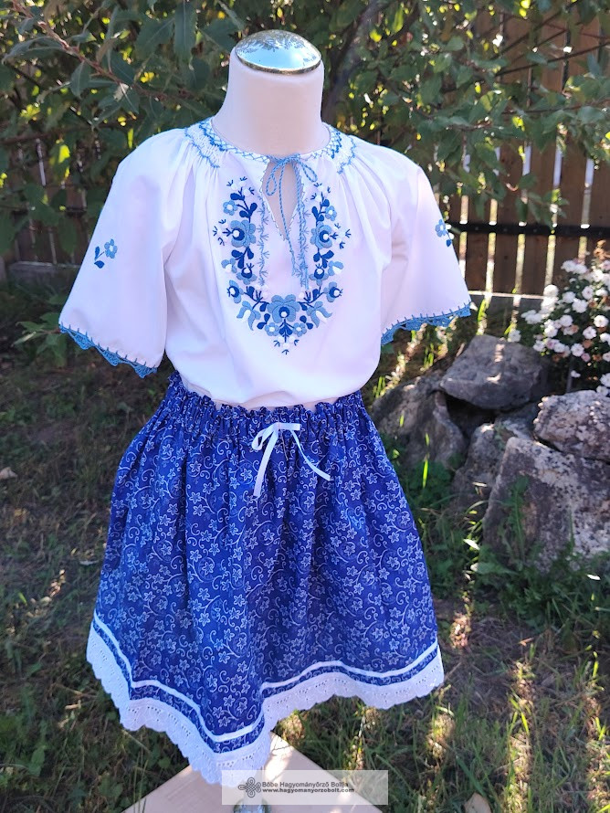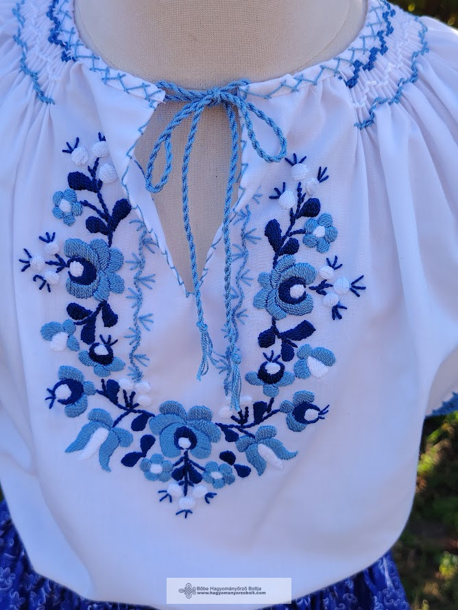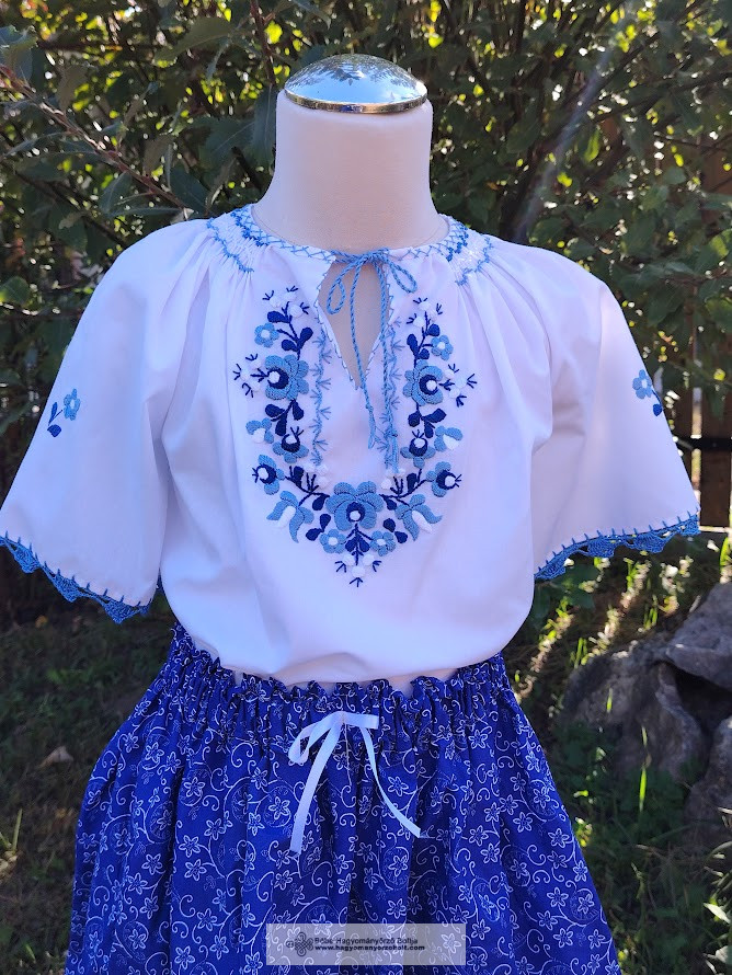 A blúz kézzel hímzett, horgolt és szmokkolt, a kék matyó virágmotívumok pedig életre keltik a magyar népművészet gazdagságát. Minden darab egyedi, hiszen a kézimunka apró eltérései adják meg a varázsát. A minta és a színek a képtől eltérő lehet.