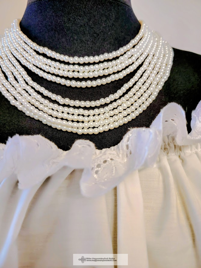 A többsoros kialakítás gazdag, ünnepélyes megjelenést ad, miközben a fehér szín tisztaságot, nőiességet és eleganciát sugároz. A szatén szalagos megkötő nemcsak esztétikus, hanem praktikus is: a kaláris mérete könnyedén állítható, így különböző nyakkivágásokhoz és viseletekhez is tökéletesen illeszkedik.